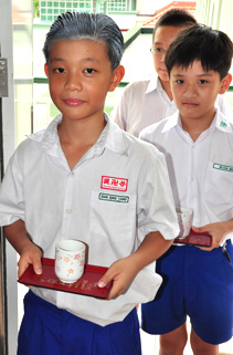 Organizing the appreciation tea ceremony for the third year, Mr Gau Poh Teck (right), principal of Mee Toh School, feels that it is imperative to inculcate values such as respect for the elders and reciprocity in the students. (Photo by Lim Chwee Lian)