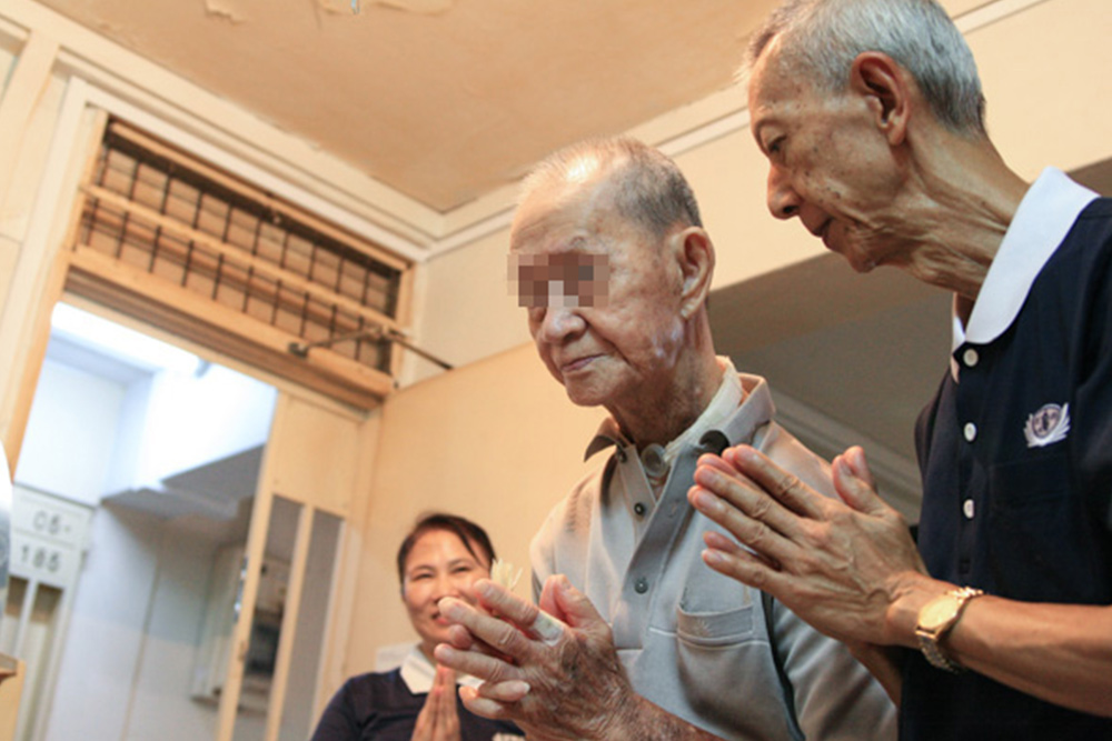 Ng Kok Leong (right), Judy Lo (left) together with three other volunteers are accompanying an elderly care recipient in paying respect to Buddha during a mini Buddha Bathing Ceremony at the care recipient’s home in 2015. (Photo by Fong Kwai Kin)