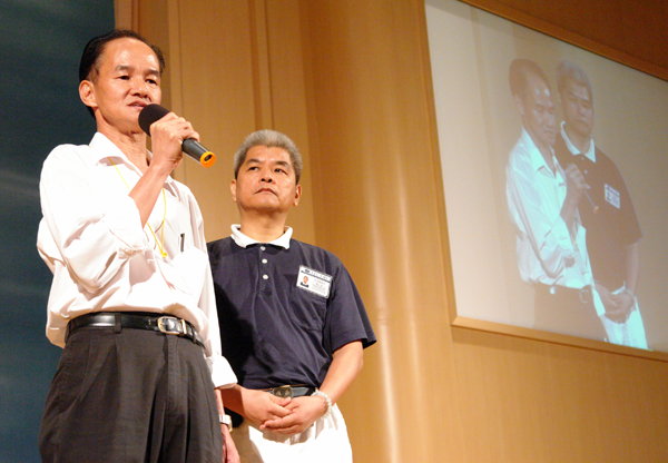 On 9 September 2006, after the unfortunate passing of his son, Guan Zheng, Chen Ming Fu drew strength from his grief and took his son’s place onstage during the Mid-Autumn distribution event, sharing his experience and encouraging those who were stricken by illness. (Photo by Wu Xiao Hong)