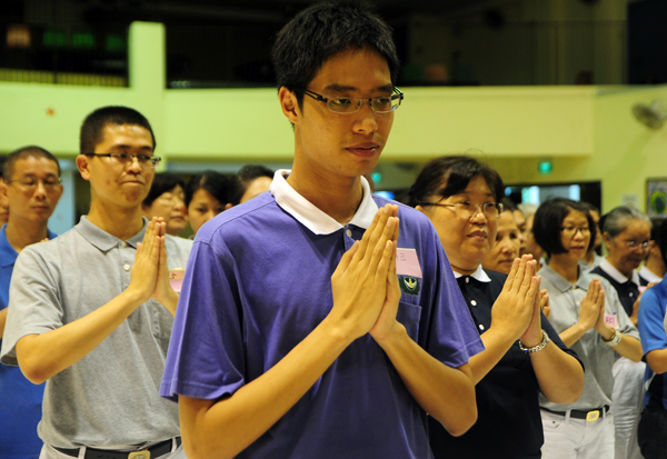 In the past, Chen Guan Wen had the impression that Tzu Chi was solely a religious organization. He told his father that he would like to join Tzu Chi Collegiate Youth Association (Tzu Ching) only after he entered NUS. With his son's wish in mind, Ming Fu requested that the volunteers guide his son and six months later, Guan Wen successfully donned the Tzu Ching uniform. (Photo by Pua Poo Toong)