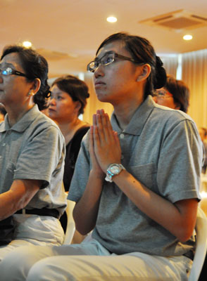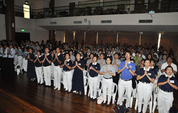 钟鼓齐鸣、《炉香赞》起,高雄巨蛋的两千多位入经藏菩萨缓步轻移,众人齐诵:“炉香乍热,法界蒙熏,十方诸佛海会悉遥闻,随处结祥云,诚意方殷诸佛现全身……”新加坡慈济人双手合十,在庄严的唱诵声中开启了法会。