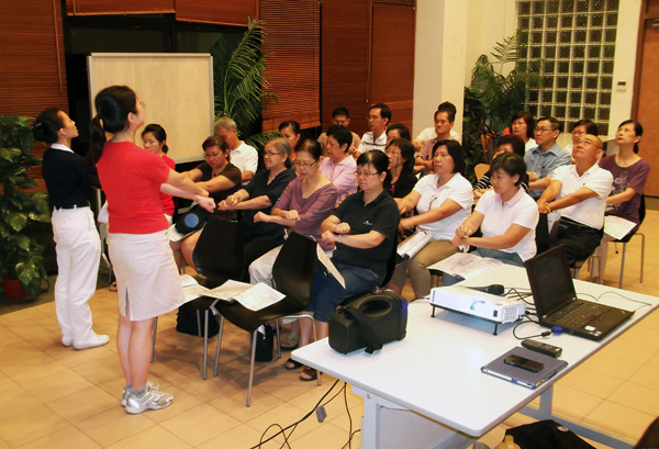 新加坡地小人稠,组屋密集。志工们善用组屋一楼空地、篮球场、社区居委会、志工的家、环保点、向学校商借场地等等,无论空间大小,只要一台电脑,一个小型扩音机,就地一站,就是一个排练场地。梵音袅袅、慈乐飘扬,几乎每晚都有妙手妙音练习与排练,挑战各种有形无形的局限与障碍,精进不懈怠,在社区形成一道庄严的“说法风景线”。