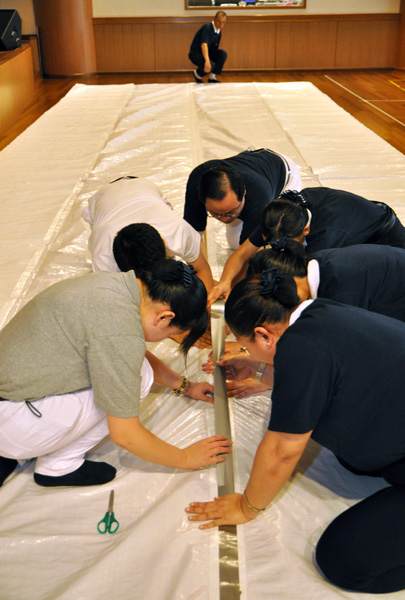 11月11日,社区环保活动后,志工们来到静思堂,完成佛堂地板的标兵,以便晚上能让东区志工进行第一次的队形排练。佛堂地板标兵完成后,大家把半透明的帆布直接铺在地板上,在短短一小时内循迹贴好了帆布的“移动标兵”。
