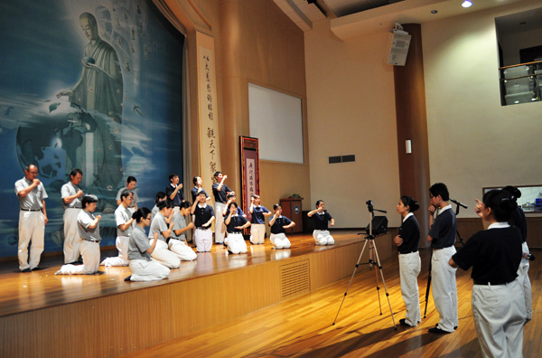 2012年6月9日,参与台湾水忏演绎种子企划研习营人员聚集静思堂与新加坡合心团队做分享,随后以「感恩.欢喜∙七月吉祥」祈福会为第一个化城,正式启动《法譬如水》经藏演绎。 (摄 / 黄芯桦)