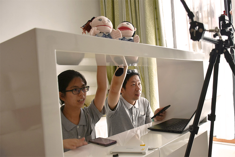 疫情下的上课日,住家客厅暂时化身摄影棚,亲子班的九人策划团队各守岗位,紧张而有序做最后测试。