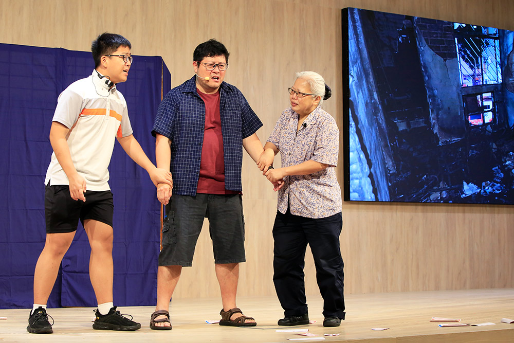 台上的短剧表演则讲述一名父亲因一心想要发财,而喜欢在家烧很多金银纸。有一天,父亲因赶时间,没等金银纸烧完便出门,导致家中失火,当回到家时,家里的东西已经被烧得面目全非。所幸全家人都平安,父亲也因此改变观念,向邻居学习如何用更环保方式祭拜。