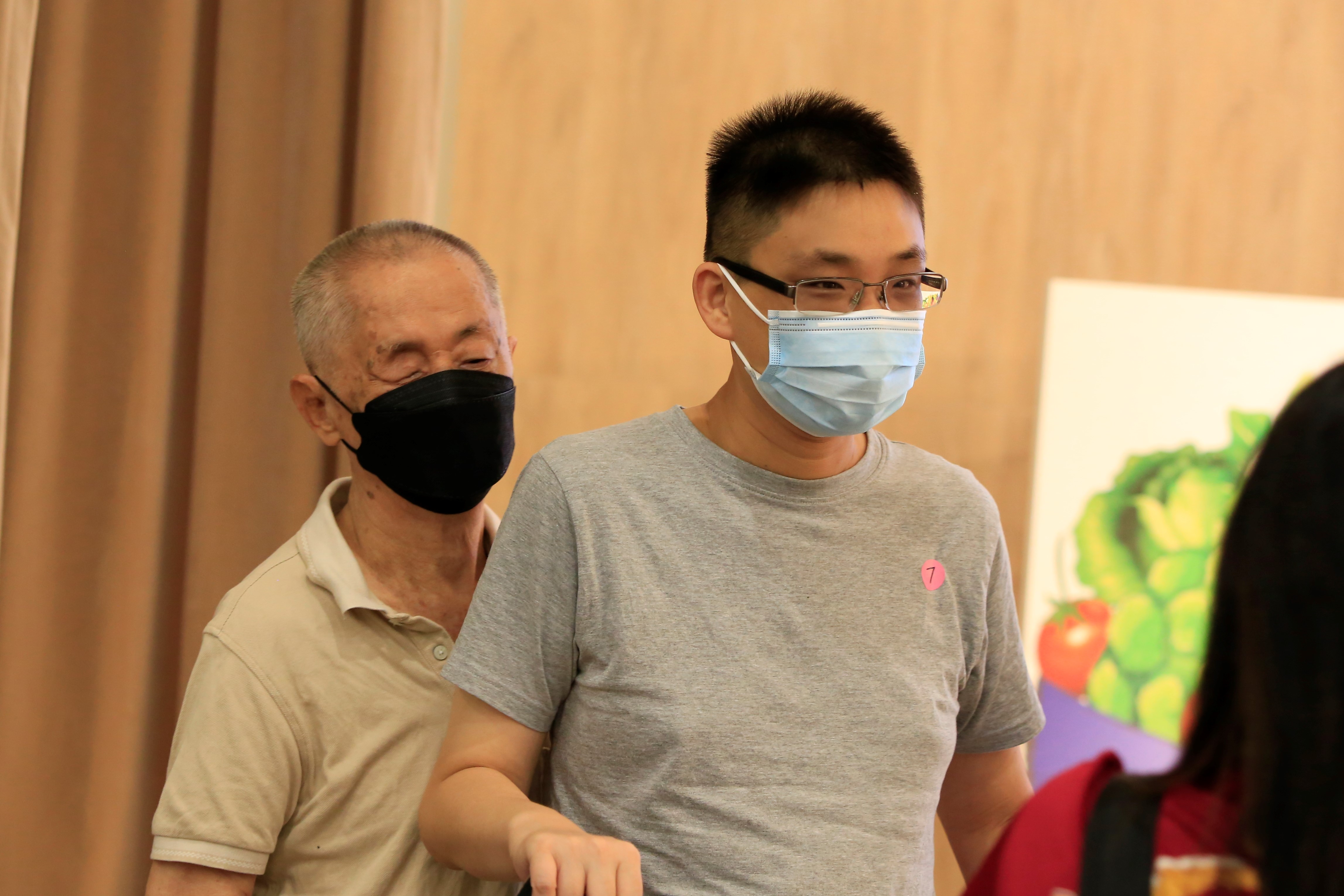 叶顺成(右)带着失明又重听的父亲前来,叶爸爸很认同不烧金银纸的环保观念。(摄/ 冯桂琼)