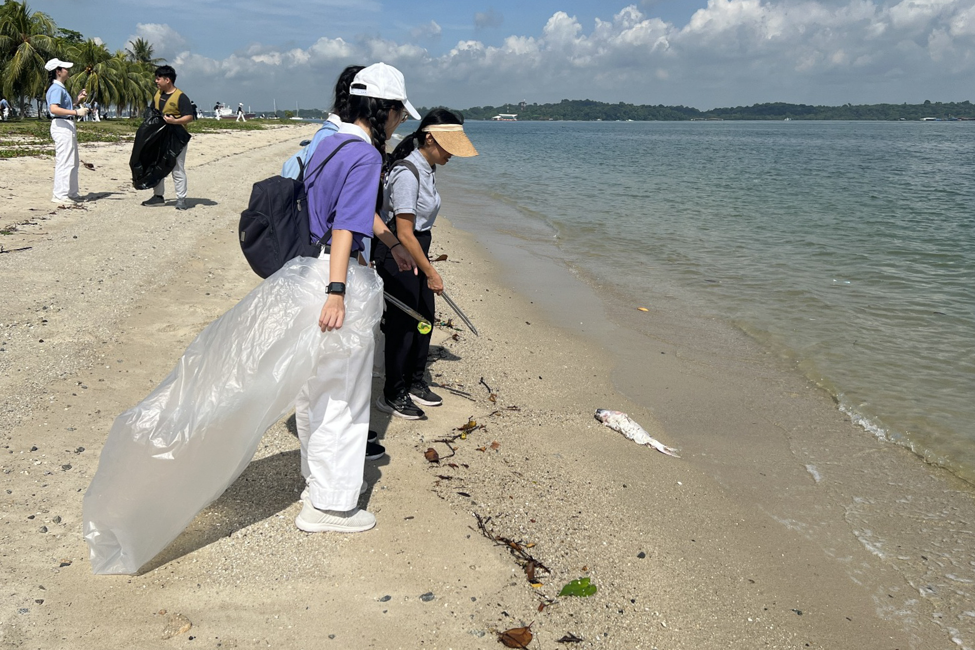 几名慈少聚集在海边讨论死鱼是否可以回收,最终决定让鱼回归自然。摄/ 吴南凯